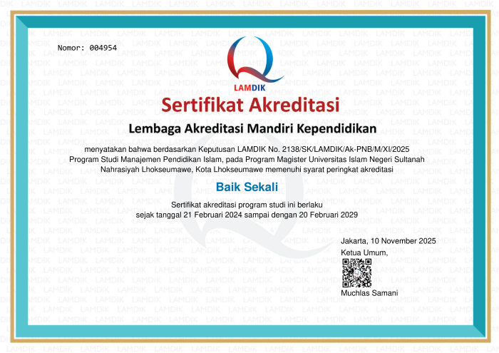 Pascasarjana UIN Sultanah Nahrasiyah Lhokseumawe terus menunjukkan komitmen terhadap mutu pendidikan tinggi dengan capaian akreditasi yang membanggakan baik dari Badan Akreditasi Nasional Perguruan Tinggi (BAN-PT), LAMDIK maupun LAMEMBA. Setiap program studi yang berada di bawah naungan Pascasarjana telah melalui proses penilaian yang ketat dan objektif, membuktikan kualitas kurikulum, tenaga pengajar, sarana prasarana, hingga tata kelola akademik yang profesional.