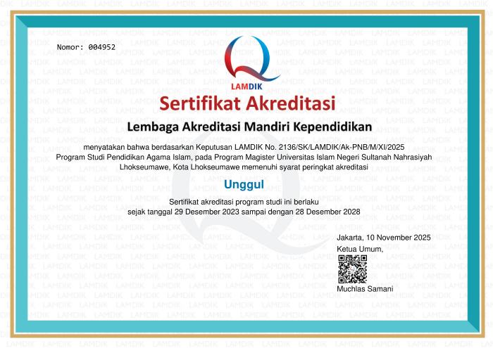 Capaian akreditasi ini bukan hanya menjadi pengakuan atas standar mutu yang telah diterapkan, tetapi juga menjadi jaminan kepada masyarakat bahwa Pascasarjana UIN Sultanah Nahrasiyah Lhokseumawe adalah pilihan tepat bagi calon mahasiswa yang ingin menempuh pendidikan tinggi berkualitas dengan landasan keilmuan Islam yang kuat, inovatif, dan relevan dengan perkembangan zaman yang berbasis digital dan kearifan lokal.