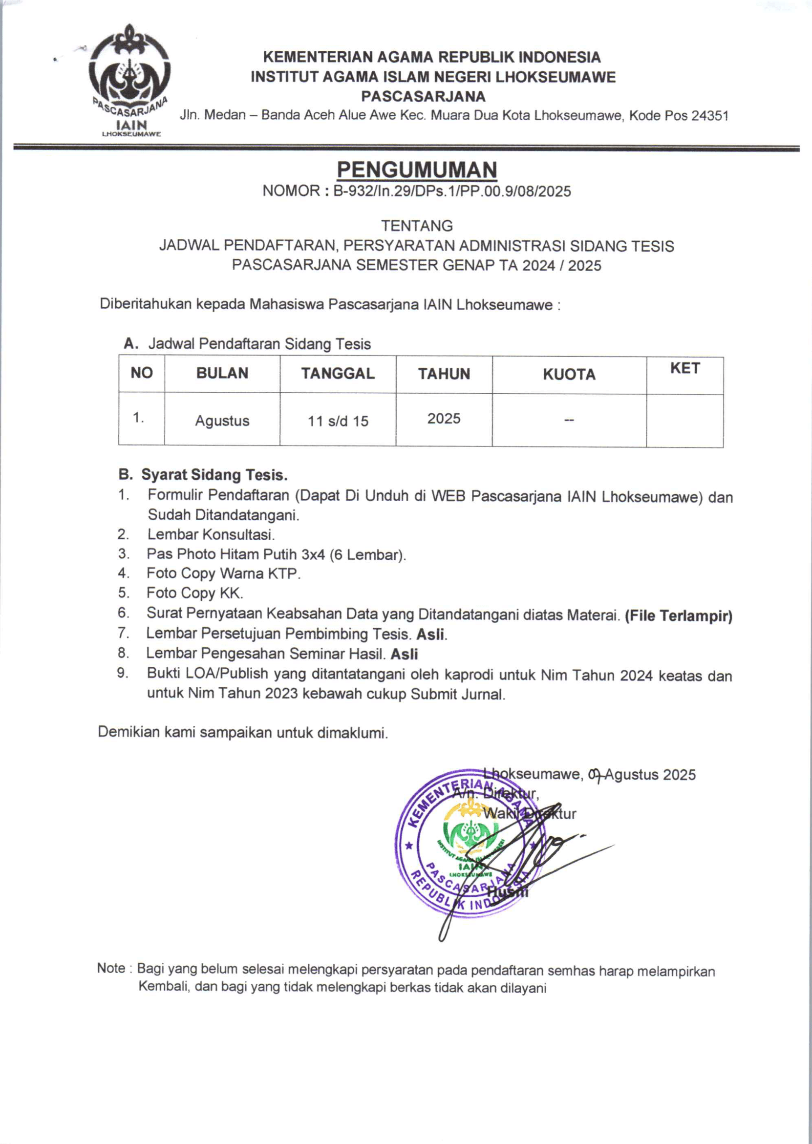 📢 PENGUMUMAN PEMBUKAAN PENDAFTARAN SIDANG TESIS PASCASARJANA UIN SULTANAH NAHRASIYAH LHOKSEUMAWE TAHUN AKADEMIK 2024/2025