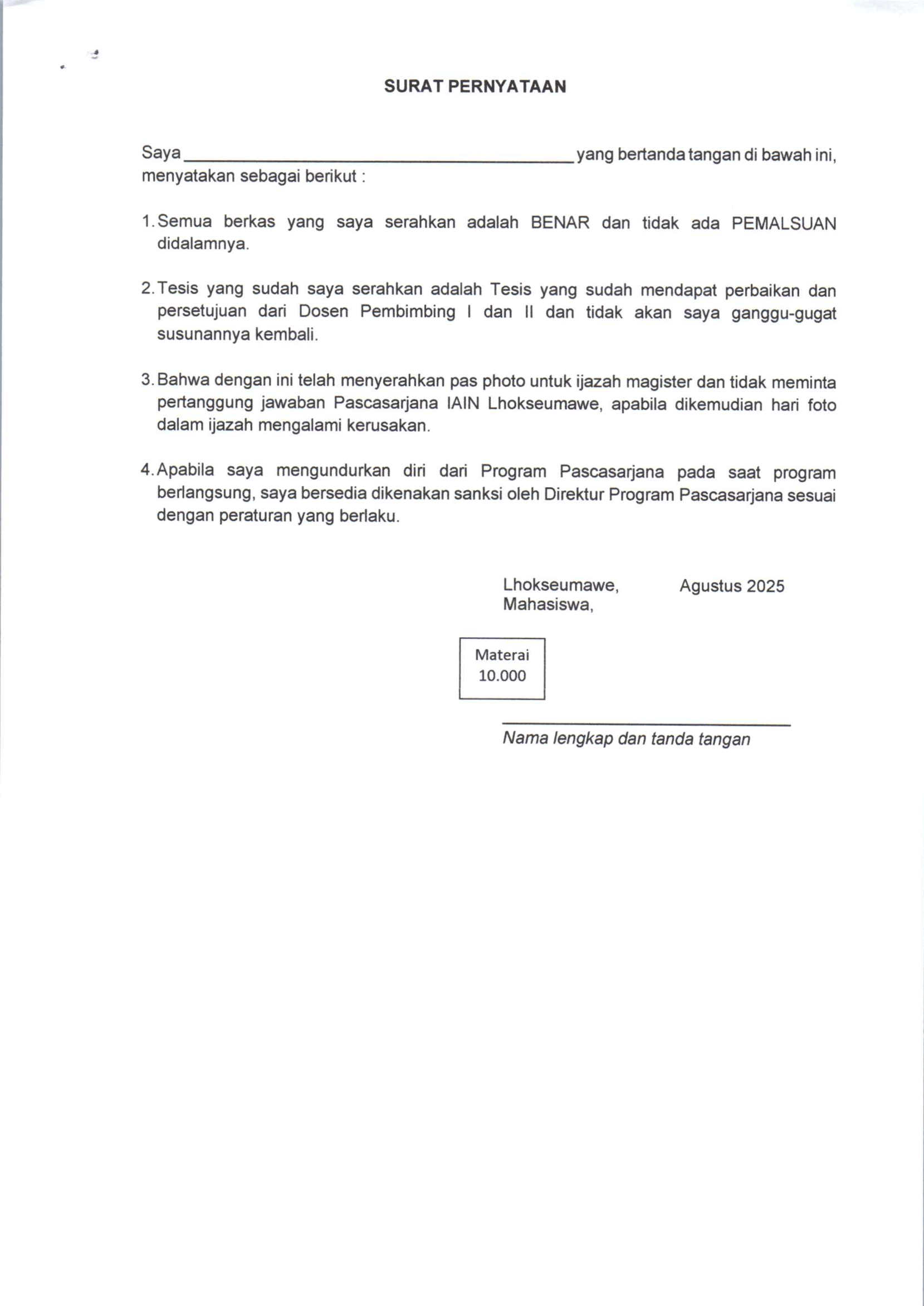 Dengan ini diberitahukan kepada seluruh mahasiswa Program Pascasarjana UIN Sultanah Nahrasiyah Lhokseumawe bahwa pendaftaran untuk pelaksanaan Sidang Tesis telah resmi dibuka. Pendaftaran ini diperuntukkan bagi mahasiswa yang telah memenuhi seluruh persyaratan akademik dan administratif sesuai ketentuan yang berlaku.