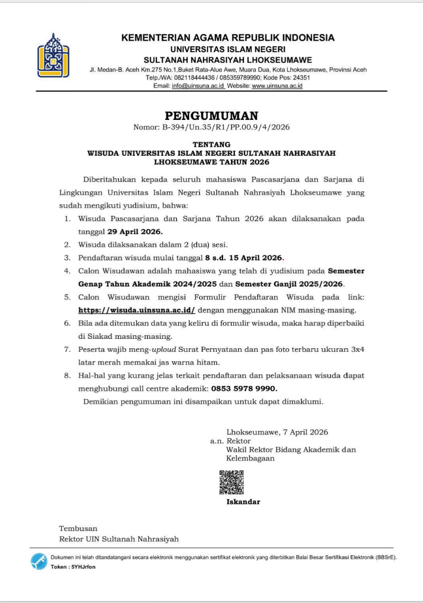 Universitas Islam Negeri (UIN) Sultanah Nahrasiyah Lhokseumawe melalui pengumuman resmi Nomor B-394/Un.35/R1/PP.00.9/4/2026 menyampaikan informasi terkait pelaksanaan Wisuda Tahun 2026 bagi mahasiswa jenjang Sarjana dan Pascasarjana. Kegiatan wisuda dijadwalkan berlangsung pada tanggal 29 April 2026 dan akan dilaksanakan dalam dua sesi.