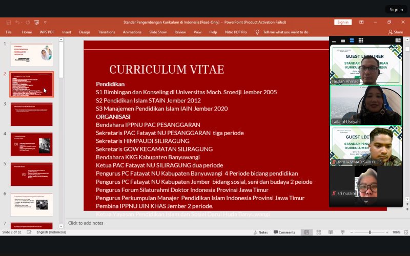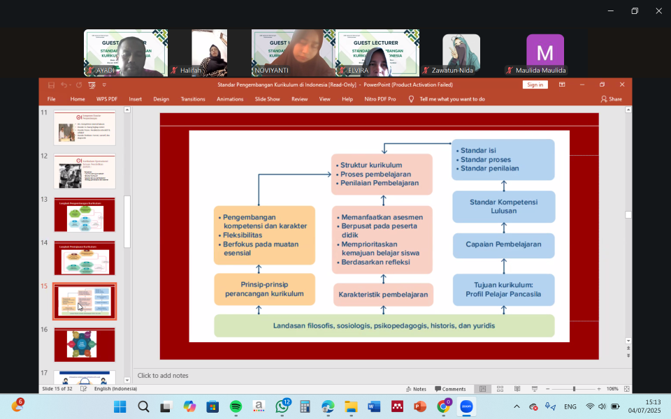 Dalam pemaparannya, Dr. Lailatul menyampaikan beragam perspektif mengenai dinamika pengembangan kurikulum di Indonesia, termasuk landasan filosofis, kebijakan nasional, pendekatan berbasis kebutuhan zaman, serta tantangan implementasi kurikulum dalam konteks pendidikan Islam di perguruan tinggi.