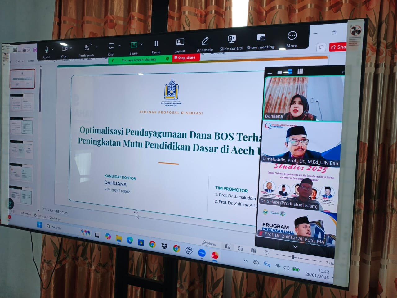 Ketiga, Dahliana, mahasiswa S3 Studi Islam Konsentrasi Manajemen Pendidikan Islam memaparkan proposal Disertasi dengan judul: "Optimalisasi Pendayagunaan Dana Bantuan Operasional Sekolah Terhadap Peningkatan Mutu Pendidikan Dasar di Aceh Utara". Seminar yang berlangsung secara hybrid ini berjalan lancar sejak pukul 11.30 Wib hingga pukul 13.00 Wib dan dihadiri oleh tim penguji yaitu: Prof. Dr. Jamaluddin Idris, M.Ed., sebagai Promotor dan sekaligus Pimpinan sidang, Prof. Dr. Zulfikar Ali Buto, M.A., sebagai Kopromotor, dan Assoc. Prof. Dr. Agus Salim Salabi, M.A., sebagai penguji.