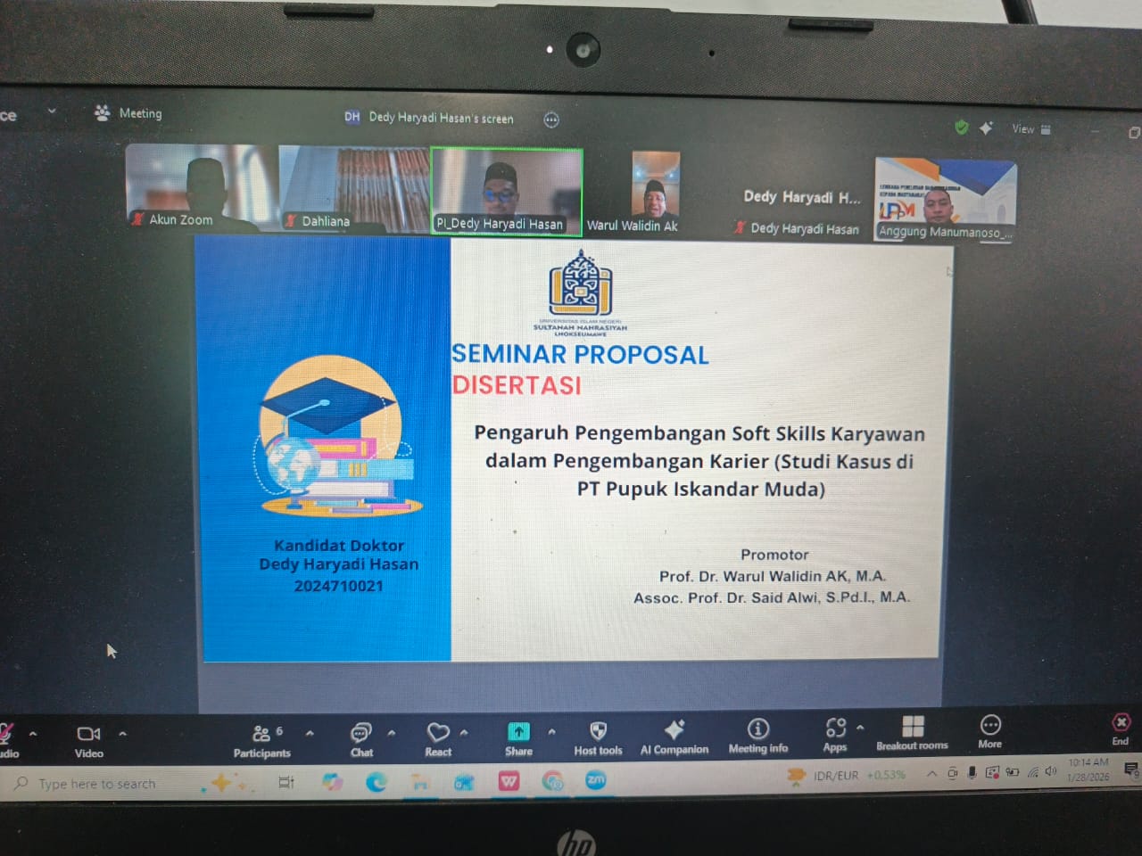 Tampil kedua, Dedy Haryadi Hasan, seorang mahasiswa S3 Studi Islam Konsentrasi Manajemen Pendidikan Islam. Dalam presentasi proposalnya dihadapan para penguji, ia memaparkan Proposal Disertasi berjudul: "Pengaruh Pengembangan Soft Skill Karyawan dalam Pengembangan Karier (Studi Kasus di PT Pupuk Iskandar Muda)". Seminar proposal ini berlangsung secara daring yang dibersamai oleh para penguji yang pakar di bidangnya yaitu: Prof. Dr. Warul Walidin AK., M.A., sebagai Promotor dan sekaligus pimpinan sidang, Assoc. Prof. Dr. Said Alwi, M.A., sebagai Kopromotor, dan Assoc. Prof. Dr. M. Anggung Manumanoso Prasetyo, M.Pd.I., sebagai penguji. Kegiatan ini dimulai pada pukul 10.00 Wib sampai pukul 11.30 Wib.