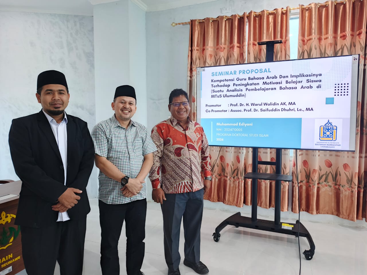 Tampil pertama, Muhammad Ediyani, seorang mahasiswa S3 Studi Islam Konsentrasi Pendidikan Agama Islam, ia mengangkat judul proposal: "Kompetensi Guru Bahasa Arab dan Implikasinya Terhadap Peningkatan Motivasi Belajar Siswa (Suatu Analisis Pembelajaran Bahasa Arab di MTSs Ulumuddin". Hadir sebagai tim penguji dalam seminar yang berlangsung secara hybrid ini yaitu: Prof. Dr. Warul Walidin AK., M.A., sebagai Promotor, Assoc. Prof. Dr. Saifuddin Dhuhri, Lc., M.A., sebagai Kopromotor dan sekaligus pimpinan sidang, dan Prof. Dr. Zulfikar Ali Buto, M.A., sebagai penguji. Kegiatan dimulai pukul 08.30 Wib hingga pukul 10.00 Wib berlangsung lancar dan khidmat. Para penguji memberikan banyak masukan dan saran ilmiah secara mendalam untuk penguatan dan pendalaman isi proposal.